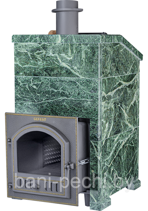 Чугунная Банная Печь «Гефест Гром 50П Президент Змеевик» с панорамным стеклом в облицовке Змеевик