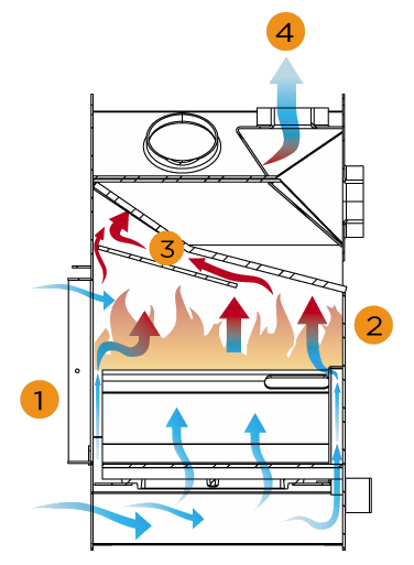 ➌ Горячие дымовые газы проходят через каналы в верхней части каменки, эффективно передавая тепло на раму каменки, камни и все помещение сауны.
